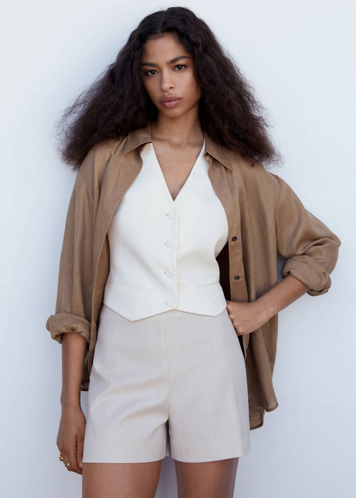 Linen and cotton blend fabric. Straight design. Short design. High waist. Side zip fastening. Available Plus