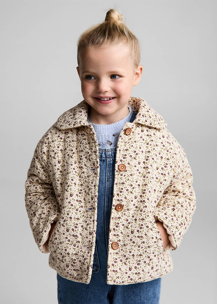 Tissu en coton mélangé. Coupe droite. Imprimé floral. Col babydoll. Manche longue. Doublure en polaire. Étiquette pour données personnelles. Boutons imitation bois. Fermeture à boutons à l'arrière