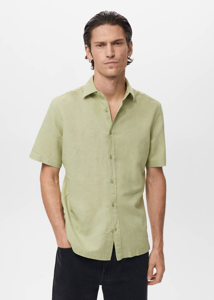 Coupe regular. Tissu mélange de lin et coton. Col chemise. Manches courtes. Fermeture avant avec boutons