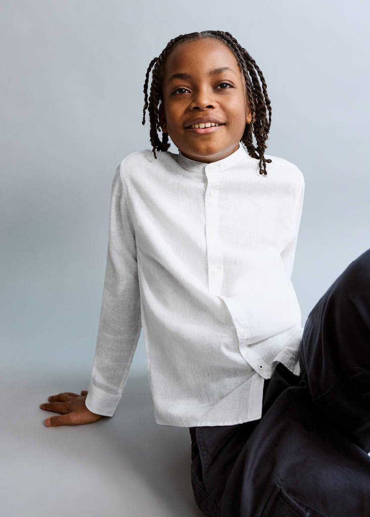 Cotton and linen blend fabric. Straight design. Stand-up collar. Long sleeves with buttoned cuffs. Front closure with buttons. Swimwear collection.