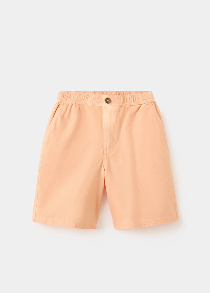 Cotton and linen blend fabric. Straight design. Short design. Elasticated waist. Two side pockets. Two back welt pockets. Zip and button fastening.