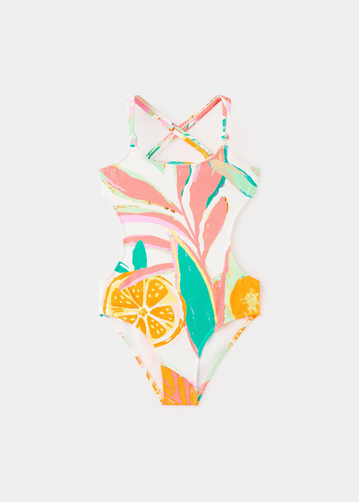 Stretch fabric. Textured fabric. Printed design. Fruits design. Crossover straps on the back. Side slits detail. Swimwear collection.