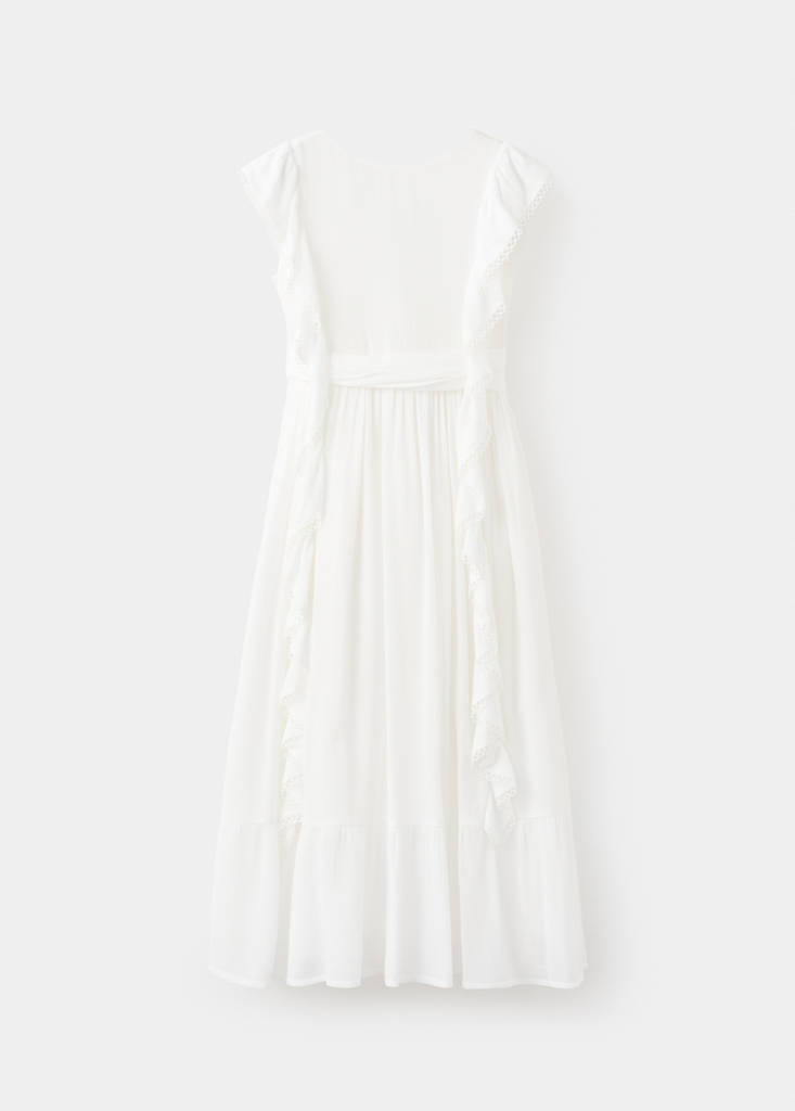 Fluid fabric. Straight collar. Ruffled straps. Bow detail at the waist. Lace details. V-neckline in the back. The model is 145 cm tall and is wearing size 10. The length of the dress is 109 cm. Party, ceremony and communion collection.