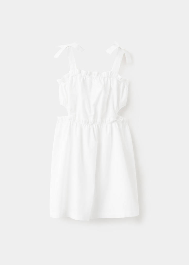 100% cotton fabric. Short design. A-line design. Straight collar. Straps with bow closure. Cut-out detail on the sides. Ruffles detail on the neck