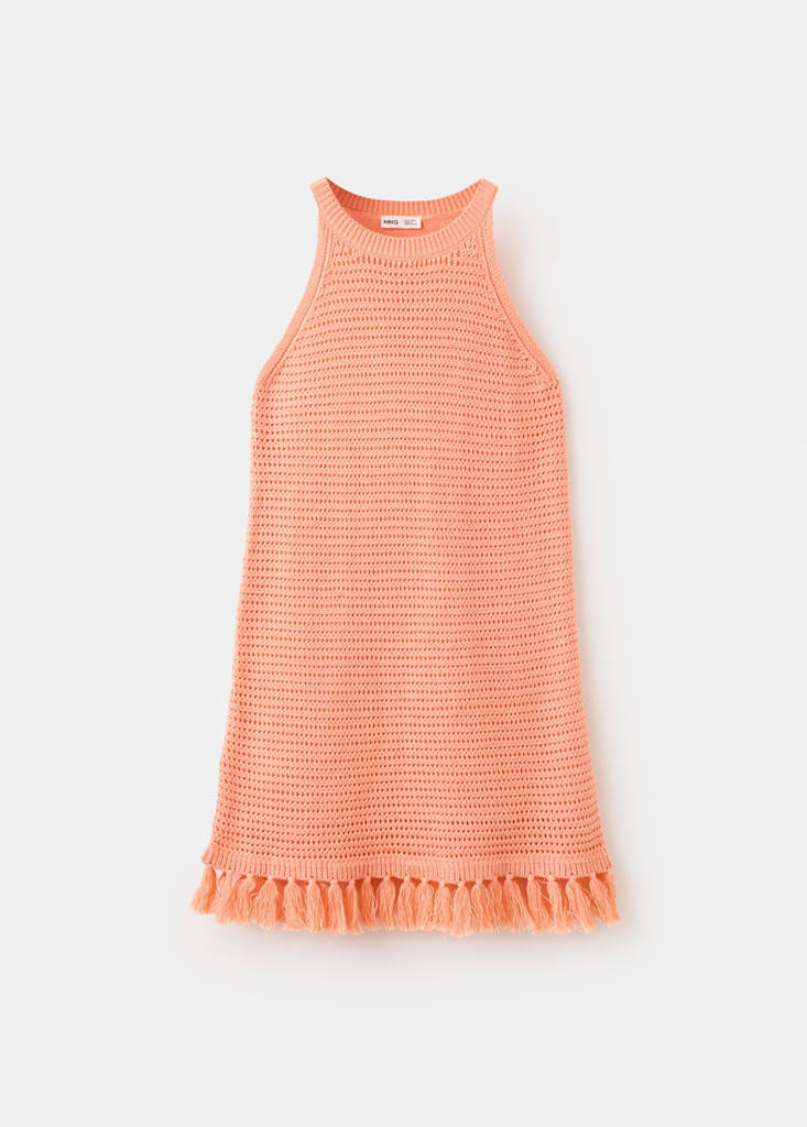 100% cotton fabric. Straight design. Long design. Open-knit fabric. Round neck. Sleeveless. Fringe detail on the hem.