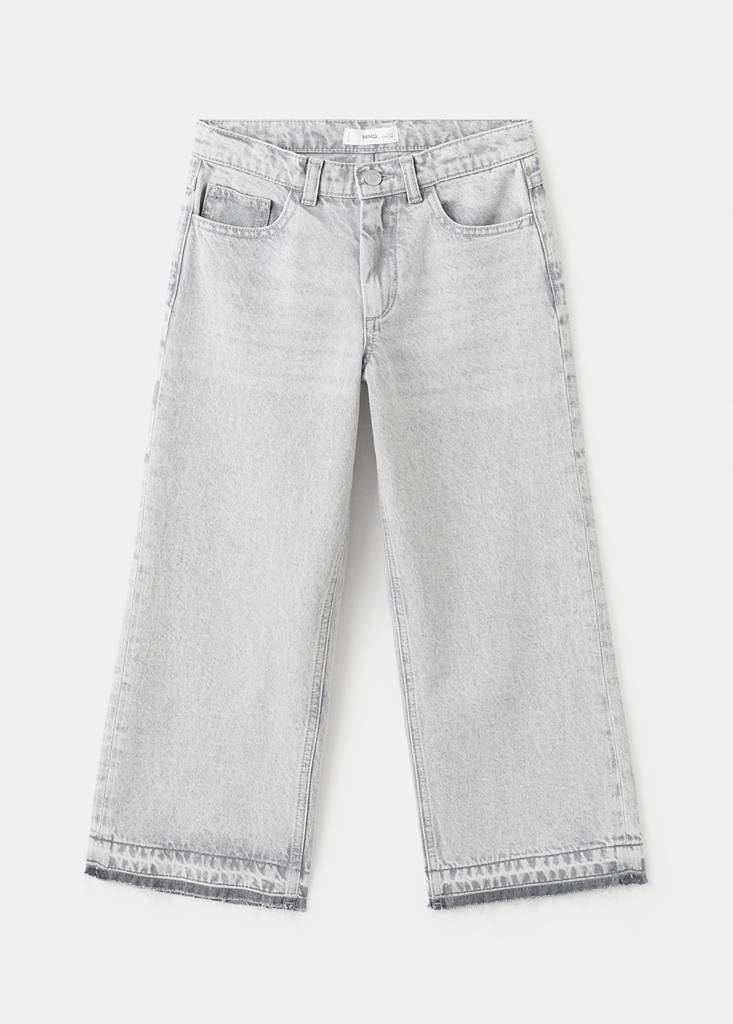 Standard Length. Straight Silhouette. Medium Flat Structure. Regular Waist. 100% cotton fabric. Denim-style cotton fabric. Culotte design. Belt loops. Zip and button fastening. Adjustable elastic and button waistband. Coin pocket. Two side pockets. Patch pockets on the back. Seamless hem. Frayed trouser hems.