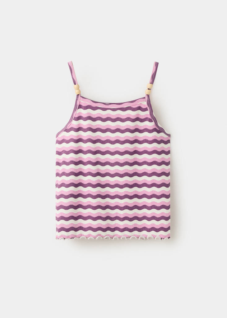 Cotton fabric. Straight design. Multicoloured wave design. Round neck. Thin straps. Scalloped details. Bead detailing on the shoulder straps.