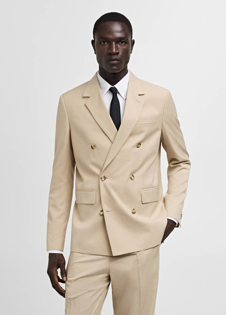 Regular fit. Wrap design. Recycled polyester material. Notch lapels and buttonhole. Front closure with crossed buttons. Chest welt pocket. Two pockets with flaps on the front. Double back slit. Button up. Inner lining. Interior pocket. Tailoring collection. Long buttoned sleeves