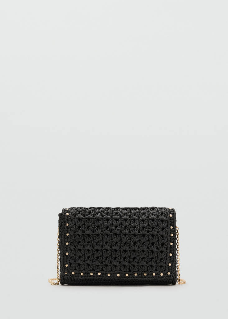 Natural fibre shoulder bag with studsCurrent price [Den 2,990.00 ]Den 2,990.00Select a colourBlackSelect your sizeOne sizeAdd to WishlistSee lookFree delivery to storeSee availability in storeDescriptionSmall size. Natural fibre fabric. Long detachable chain strap. Stud detail. Interior pocket. Flap closure with magnetic button. Inner lining.See detailsShare