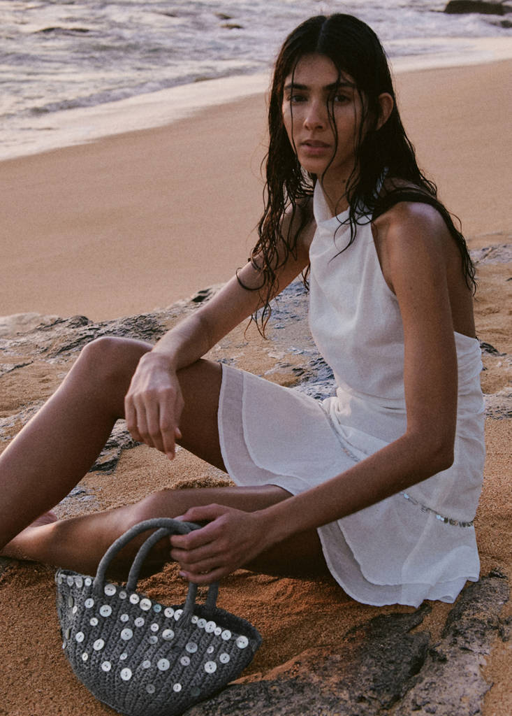 Natural fibre fabric. Small size. Two short hand grips. Decorative buttons. No Fastening