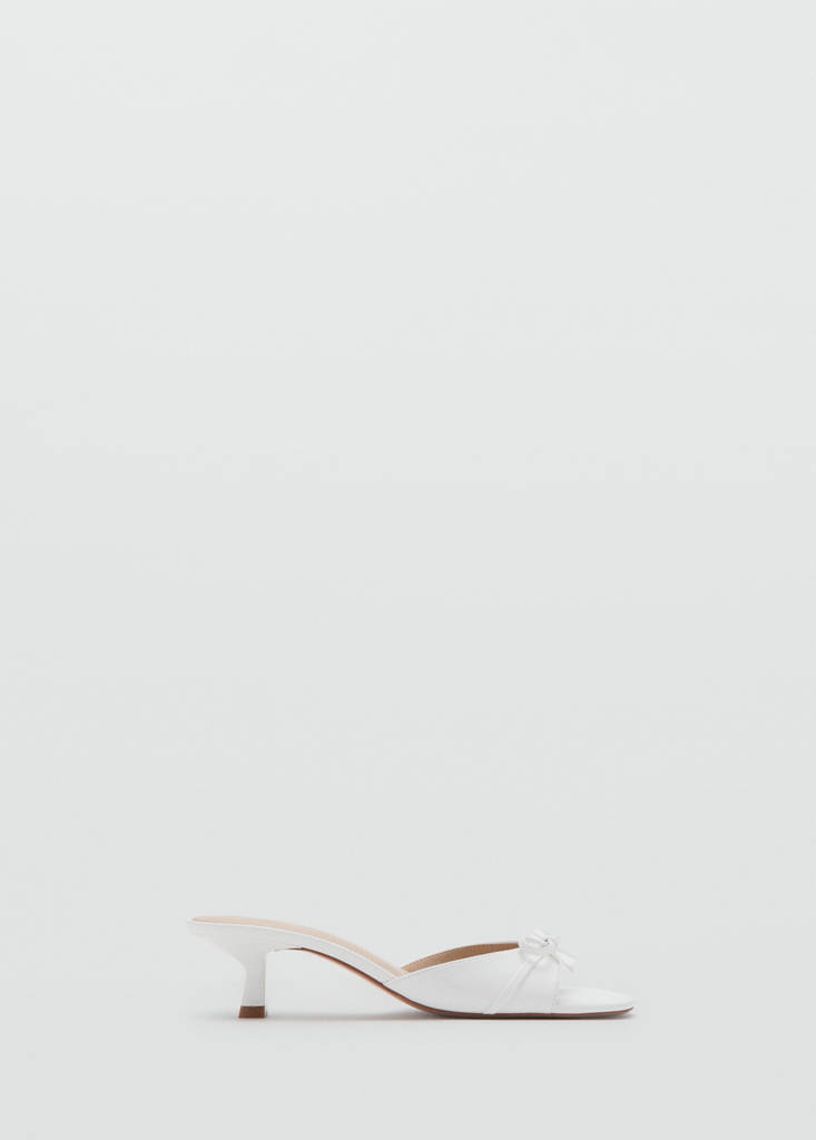 Faux leather. Strip design. Bow detail. Open toe. Slingback design. Kitten heel. 5 cm heel. No Fastening