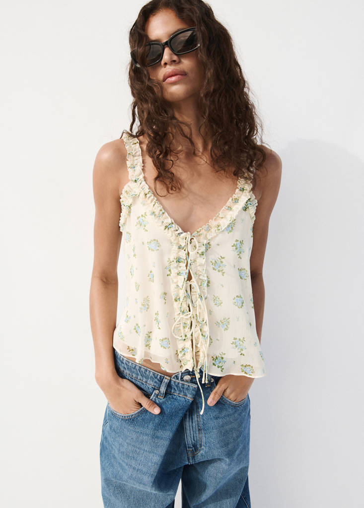 Fluid fabric. Straight design. Floral-print design. V-neckline. Straps. Ruffles detail on the neck. Bow details on the front
