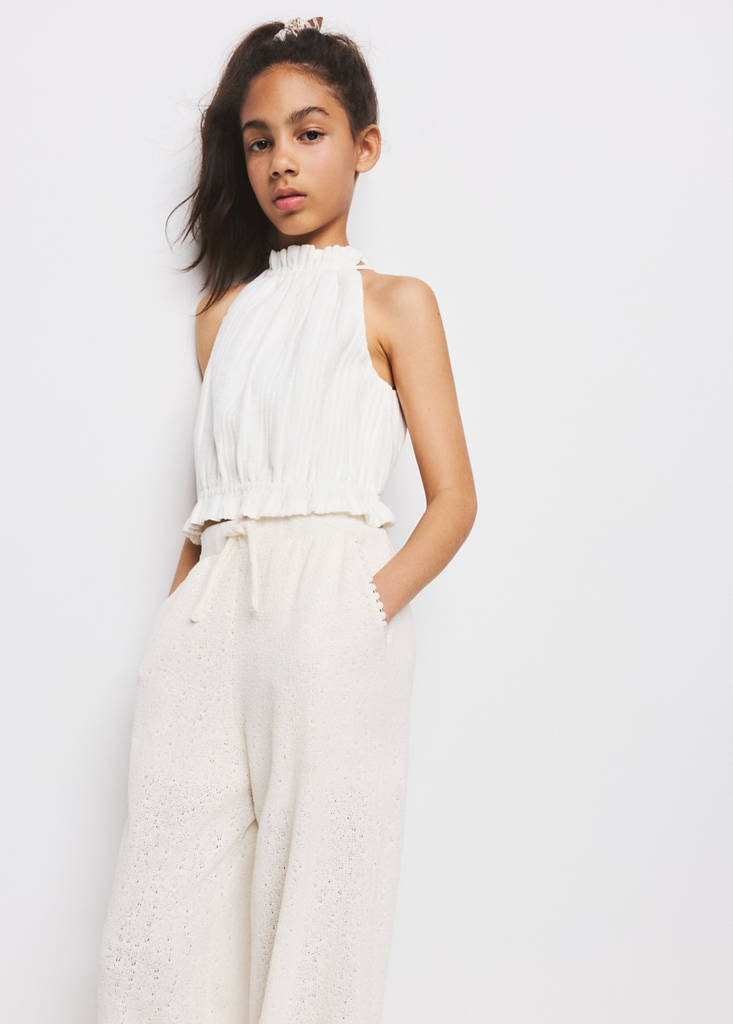 Tissu 100 % coton. Coupe droite. Col à emmanchures américaines avec volants. Sans manches. Détail de volants sur le bas. Fermeture à boutons à l'arrière