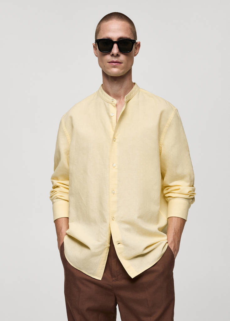Tissu mélange de lin et coton. Tissu léger. Col mao. Fermeture à boutons sur le devant. Manches longues et poignets boutonnés. Classic-fit. Ourlet arrondi