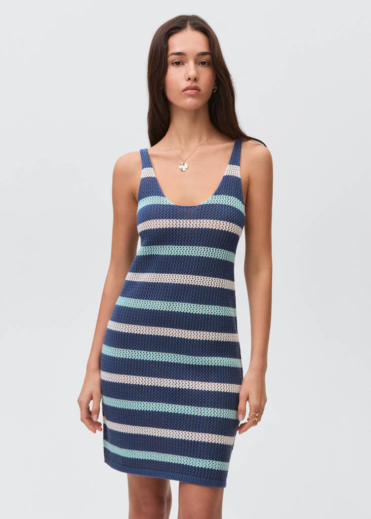 Tissu de coton. Maille ajourée. Coupe droite. Coupe courte. Motif rayé. Col en V. Sans manches
