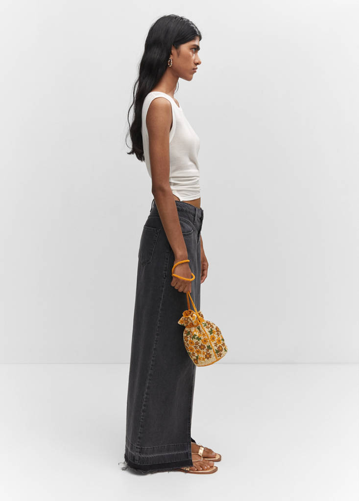 Small, bucket design, combined beads, floral pattern, two long handles, inner lining.