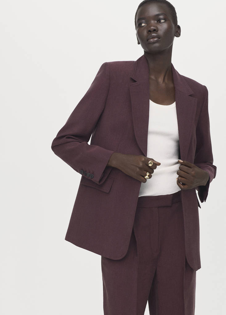 Straight design. Suit style. Lyocell fabric. Lapel-collar V-neck collar. Lapel with notch. Long sleeves with buttoned cuffs. Two side pockets with flaps. Front button closure. Total look. Available Plus.