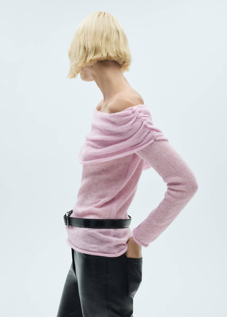 Knit fabric. Gathered detail. V-neck. Long sleeves. No Fastening. Standard design. Slim fit. Midpoint. High neck