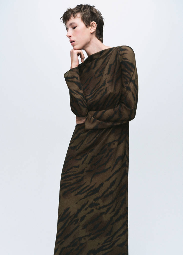Satin fabric. Animal print. Midi design. Straight design. Boat neckline. Long sleeves. Button closure at the back. Inner lining.