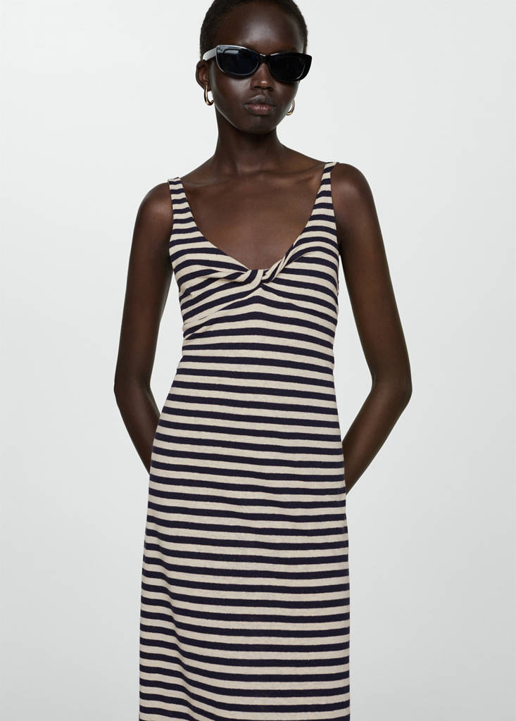 Linen mix. Straight design. Midi design. Long design. Round neck. Thin straps. No Fastening. Knot detail. Draped detail. Sleeveless.