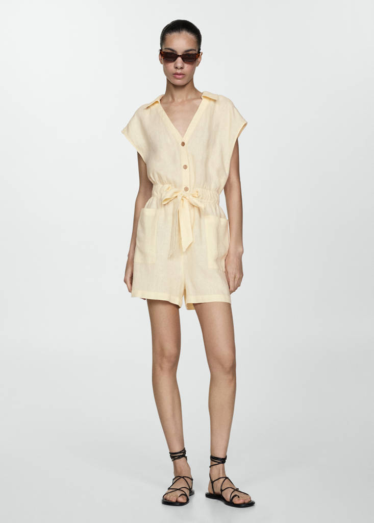 100% linen fabric. Short design. Straight design. Shirt collar. Short sleeves. Two patch pockets at the front. Elastic waist with tie closure. Front closure with buttons.