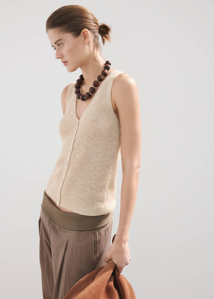 Openwork knitted waistcoatCurrent price [MMK 169,900.00 ]MMK 169,900.00Select a colourSandThe model is wearing size S and is 178cm tall.Select your sizeXXSXSSMLXLXXLAdd to WishlistSee lookFree delivery to storeSee availability in storeDescriptionChunky knit fabric. Straight design. Lapel-collar V-neck collar. Sleeveless. Wide straps. Front closure with buttons. Available Plus.See detailsShare