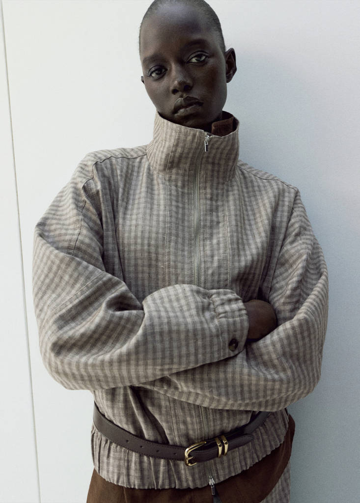Cotton and linen blend fabric. Oversized design. Print Plaid print. Funnel neck. Two side pockets with flaps. Zip fastening on the front section. Total look. Exclusive Online.