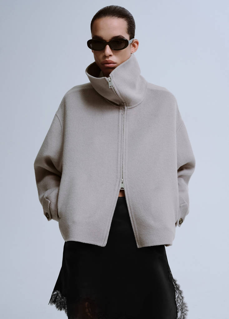 Wool mix fabric. Oversized design. Medium Length. Funnel neck. Long sleeves. Two side pockets. Front zip closure. Inner lining.