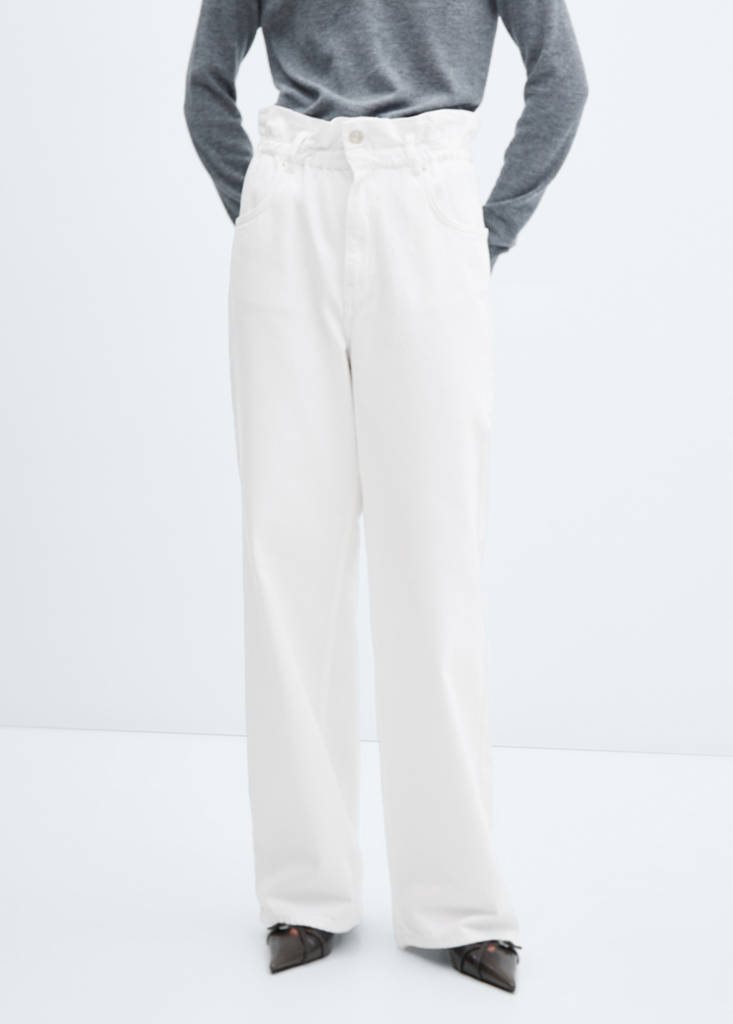 Denim style cotton fabric. Recycled cotton-blend fabric. Long design. Wide-leg design. Slouchy fit. High waist. Loops. Jeans with tie closure . Elasticated waist. Zip and one button fastening. Inseam 83 cm . Festival Season. Full length