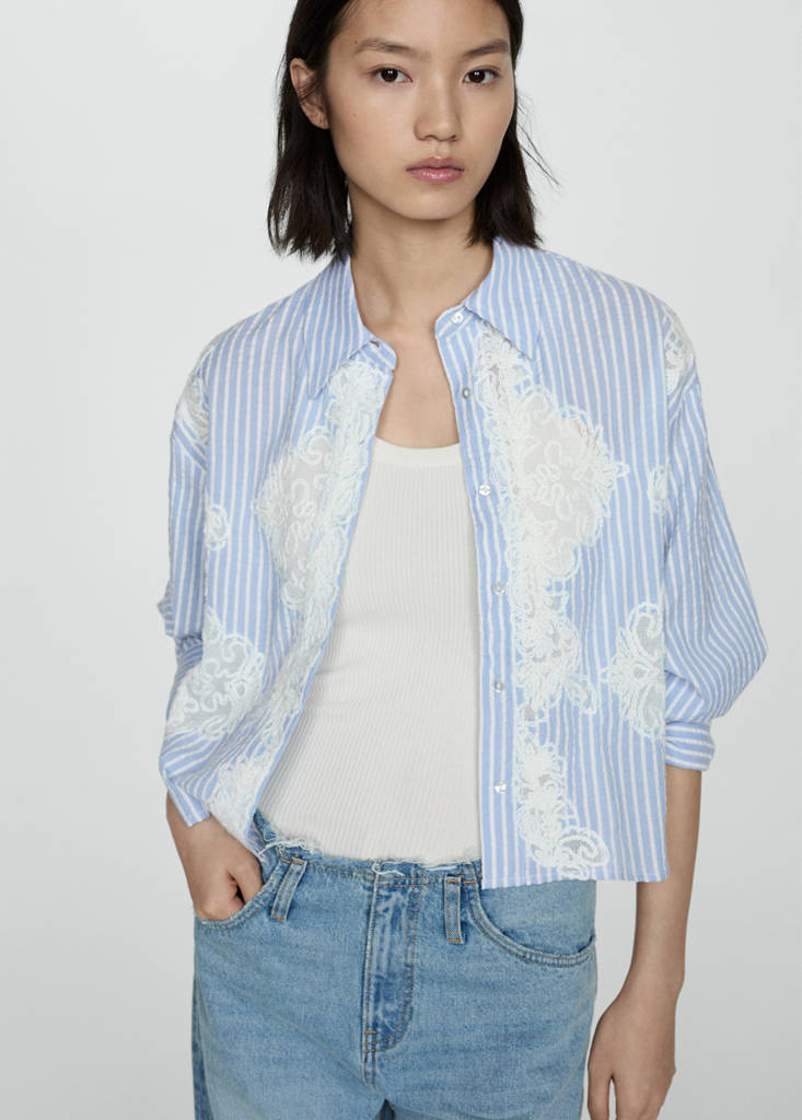 Crop design. Straight design. Embroidered panel. Shirt collar. Long sleeves with buttoned cuffs. Button fastening at the front. 100% cotton fabric