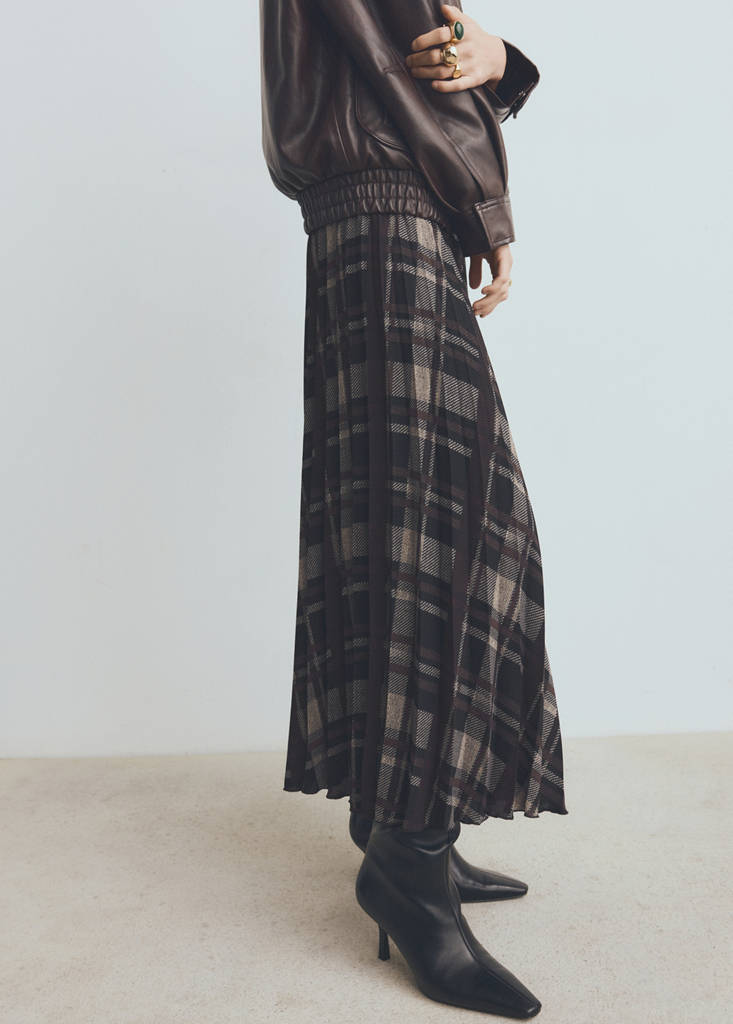 Side Closure Location. Long design. A-line design. Checked print. Tartan print. Mid-rise. Side zip closure.