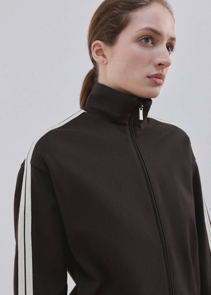 Straight design. Crop design. Contrasting stripes detail. Long sleeves. Front zip closure. High neck. Total look.
