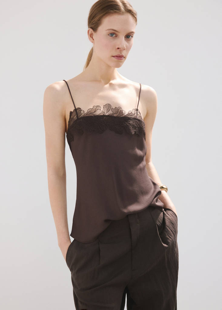 New NowLace trim topCurrent price [MMK 199,900.00 ]MMK 199,900.00Select a colourChocolateThe model is wearing size S and is 179cm tall.Select your sizeXXSXSSMLXLXXLSize guideAdd to WishlistSee lookFree delivery to storeSee availability in storeDescriptionStraight design. Lace trim. Straight neck. Sleeveless. Thin straps. No Fastening.See detailsShare