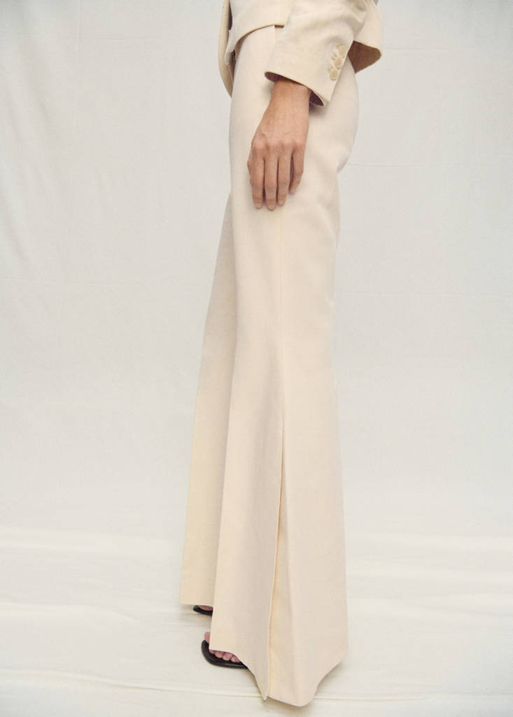 Cotton and linen blend fabric. Suit style. Long design. Flare design. Mid-rise. Belt loops. Two side pockets. Two welt pockets at the back. Concealed button, hook and zip front closure with placket. Inner lining. Total look. Selection Collection