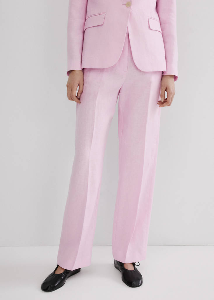 100% Linen. Straight design. Suit style. Mid-rise. Belt loops. Two side pockets. Two welt pockets at the back. Concealed button, hook and zip fastening. Inner lining. Total look. Available Plus.
