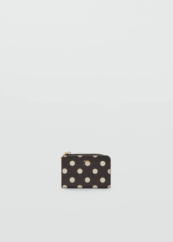 Small size. Spots print. Multiple card slots. Rectangular design. Interior zip pocket. Zip closure. Debossed logo. Inner lining.