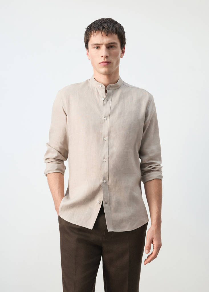ESSENTIALS: Made to last. The light blue colour is an online exclusive. 100% linen fabric. Regular fit. Standard Length. Mao neckline. Long sleeves with buttoned cuffs. Button up