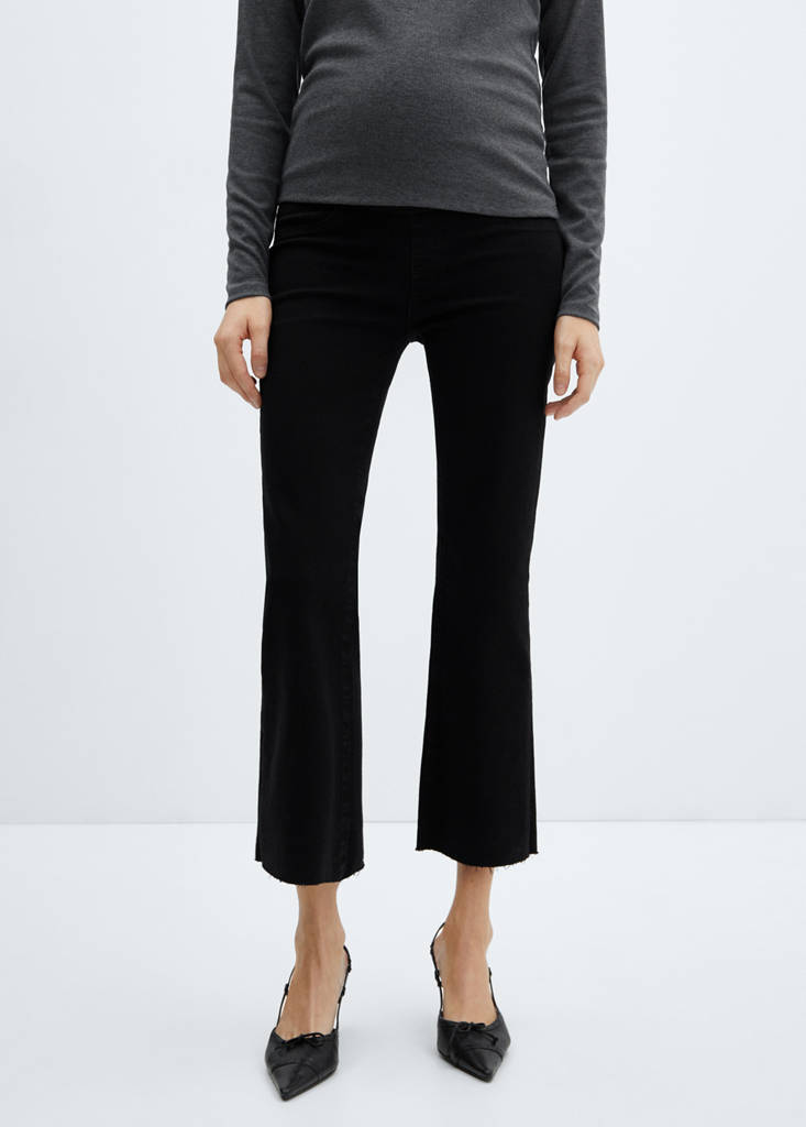 Denim-style cotton fabric. Bell design. Flare design. Crop design. Low waist. Elasticated waistband. Soft elastic at front side waistband for added comfort and support the growing bump. Without waistband. No Fastening. Inseam 68 cm. We recommend you buy your usual size. Provides comfort and freedom of movement. Maternity. Flared design