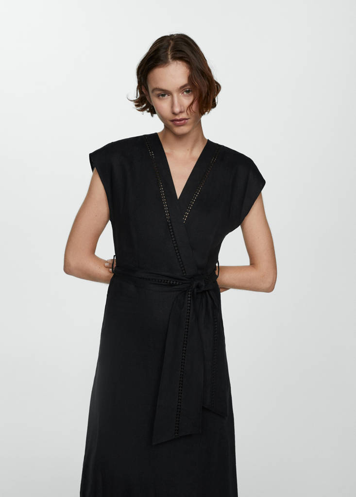 100% linen fabric. A-line design. Wrap design. Midi design. V-neck. Wrap neckline. Sleeveless. Invisible back zip fastening. Adjustable tie closure. Embroidered details