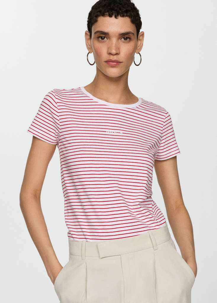 Cotton fabric. Recycled cotton-blend fabric. Straight design. Round neck. Short sleeves. Logo print. Striped design. Striped print. Logo detail. Fine knit fabric. T-shirt. No Fastening. Available in plain and patterned. 100% cotton fabric