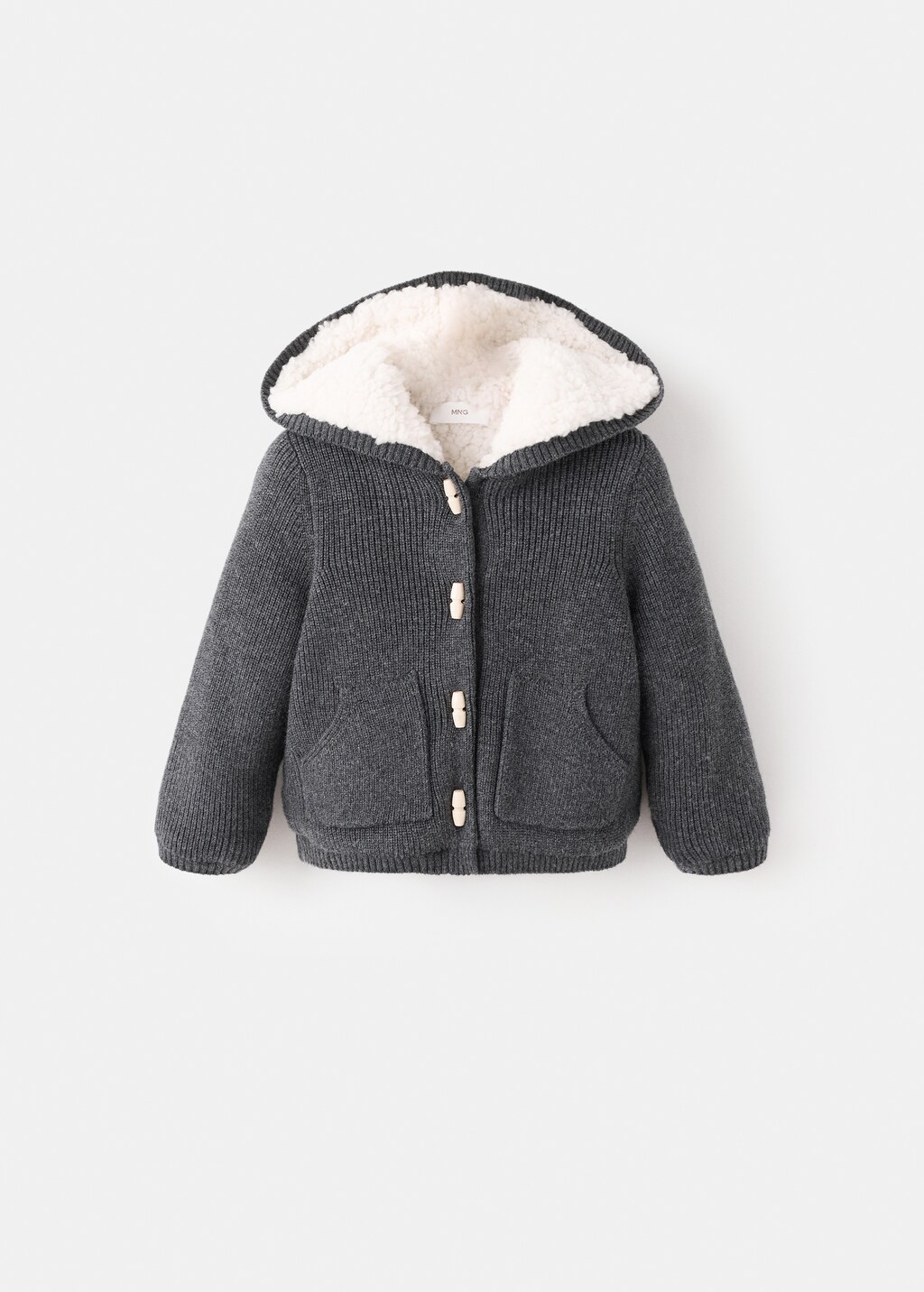 Tissu en maille. Design droit. Avec capuche. Capuche à oreilles. Manche longue. Intérieur moutonnée. Fermeture à boutons style duffle-coat. Deux poches latérales.