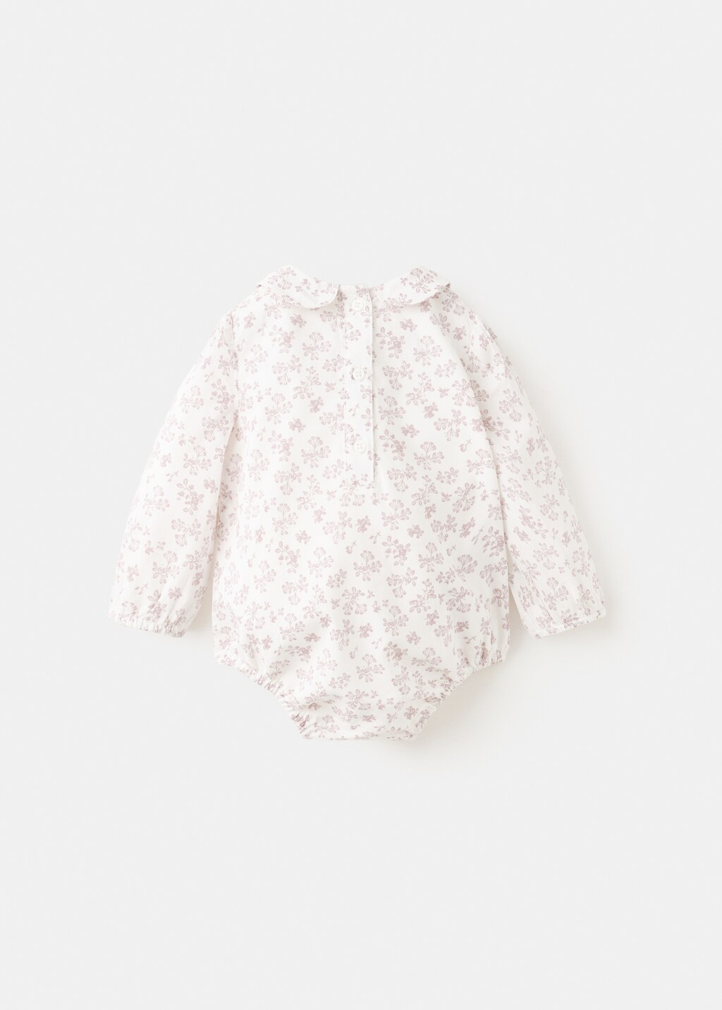 Tissu 100% coton. Barboteuse coton. Design droit. Motif imprimé floral. Col claudine. Manches longues avec poignets élastiques. Fermeture à boutons-pression à la base. Elastic trims.
