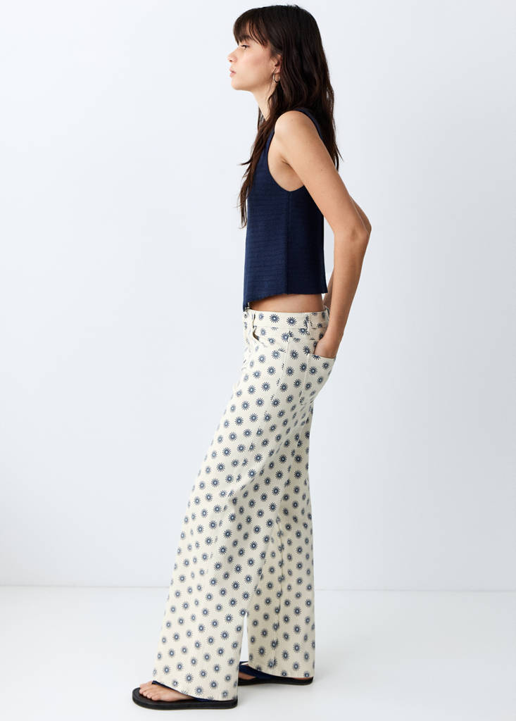 Tissu en coton de style jean. Design wide leg. Design long. Motif imprimé. Taille Regular Waist. Passants pour ceinture. Fermeture par bouton et zip