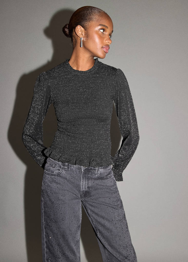 Tissu lurex. Tissu froncé en nid d'abeille. Silhouette Slim. Col rond à volant. Manches longues bouffantes. Poignets à volants. Ourlet à volants. Fermeture en goutte à l'arrière. Collection fête et événements. Collection de fêtes. Collection Noël. Design brillant
