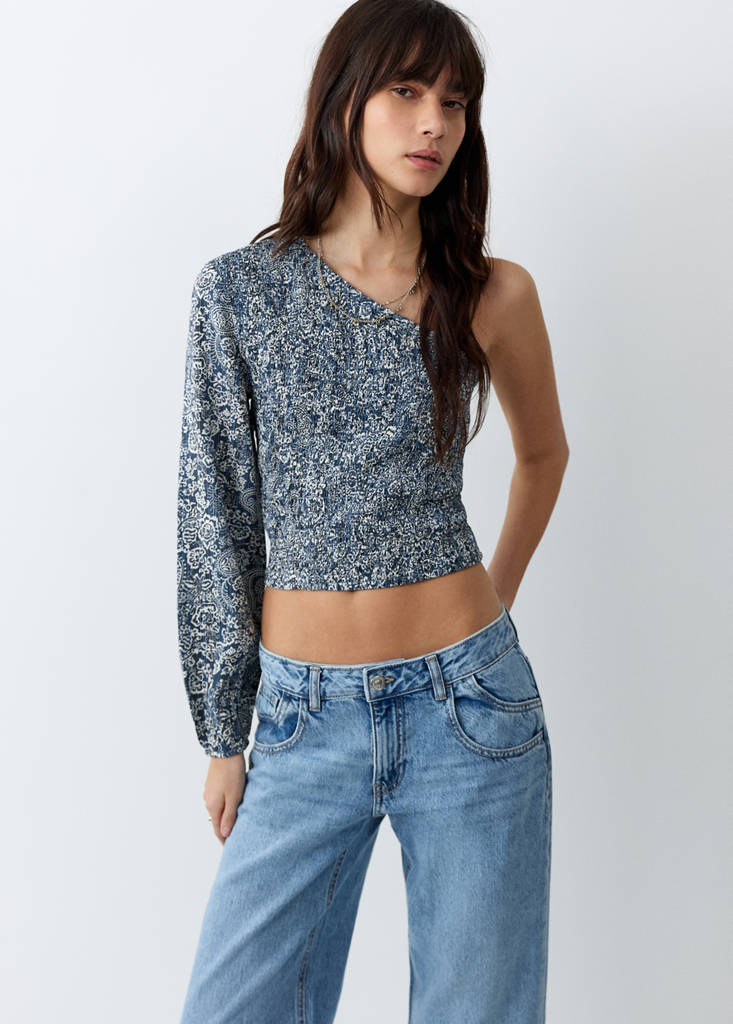 Tissu fluide. Coupe asymétrique. Motif imprimé. Détail froncé. Une manche. Total look