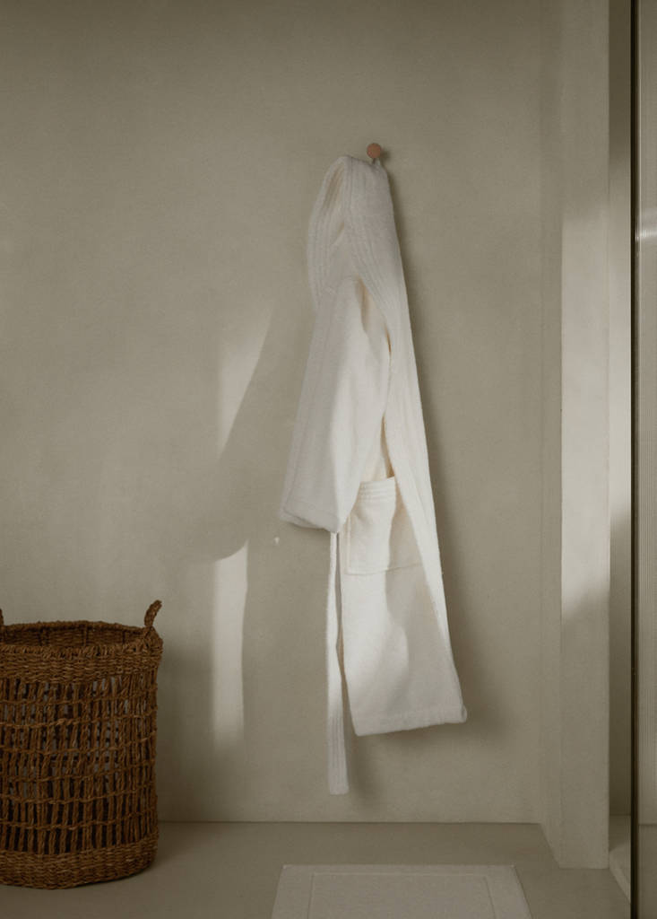 100% Cotton. Weight: 450 gr/m2. Crafted from the highest quality cotton, this bathrobe stands out for its exceptional softness and absorbency, providing a cosy and enveloping sensation after every bath or shower. Features an adjustable belt that allows it to be cinched at the waist, offering a personalised silhouette and a secure fit. Superior quality. Pleasant texture. Two patch pockets at the front. Highly absorbent and breathable for quick drying. Available in different colours. Coordinates with more products from the collection. Online Exclusive. Wide range of colors. 420 GSM. It insures a good absorption and quality. Tie at hip level