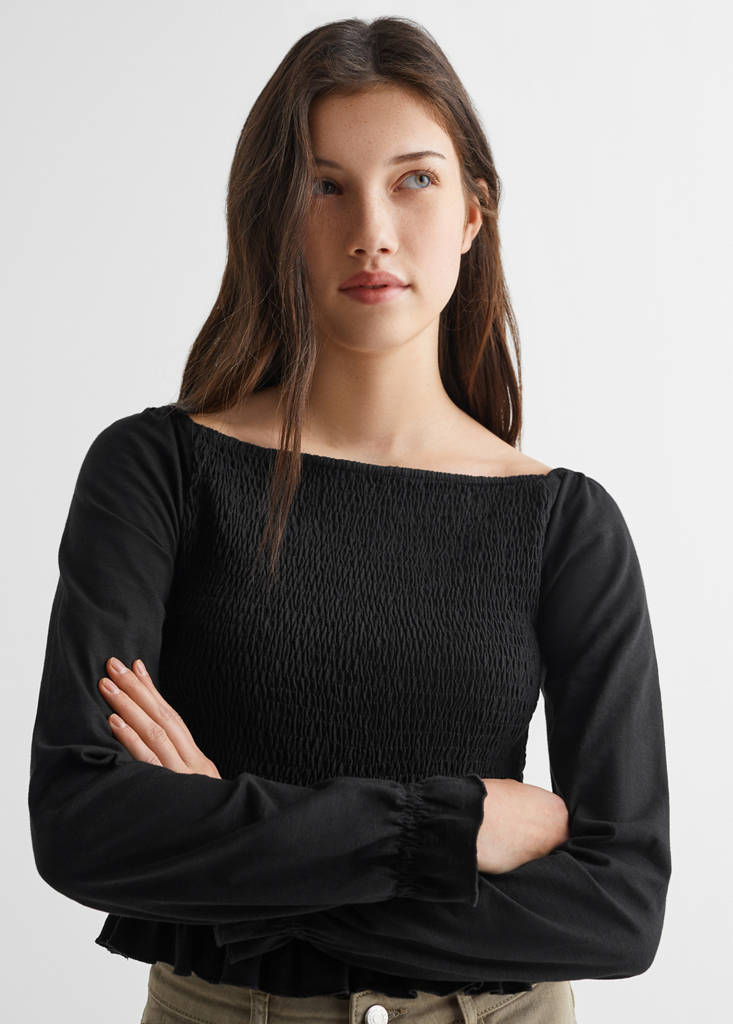Long-sleeved t-shirt with rufflesCurrent price [€ 19.99 ]€ 19.99Select a colourBlackSelect your sizeXXSNot available. I want it!XSNot available. I want it!SNot available. I want it!MNot available. I want it!LNot available. I want it!DimensionsNotify meAdd to WishlistSee lookFree delivery to storeGathered detail. Off-shoulder design. Ruffles on the hem. Straight collar. Long sleevesDetails, composition and careStore availabilityItem qualitiesRecycled cottonAt least 20%This fibre is obtained from pre- and post-consumer textile waste that is transformed into new fabrics.