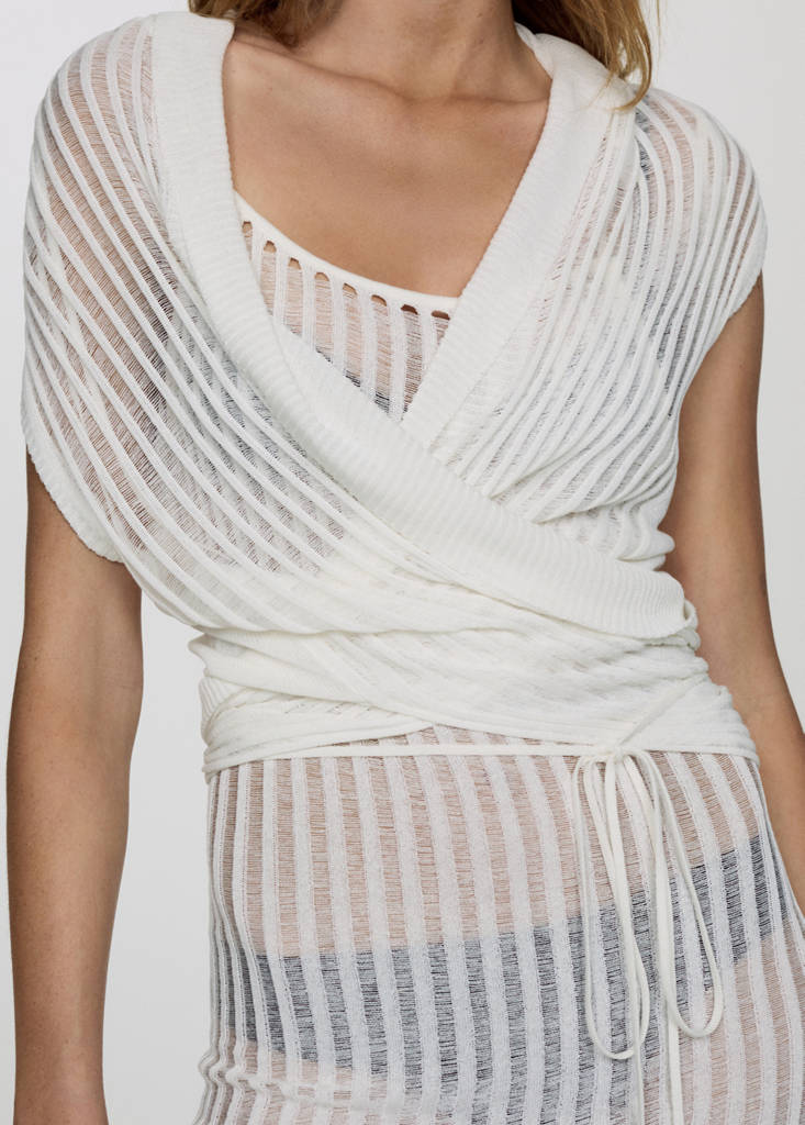 Fine knit fabric. Straight design. Wrap design. V-neckline. Sleeveless. Tie closure at the back. Unstitched knitted fabric