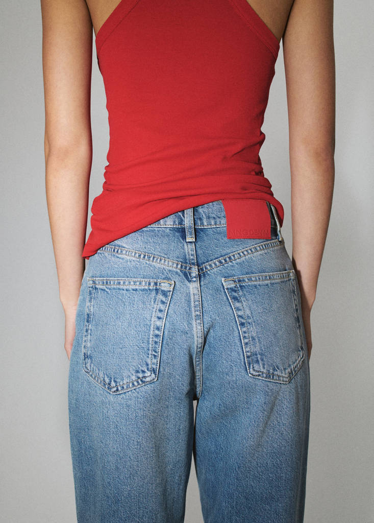 100% cotton denim fabric. Mom-fit. High waist. Belt loops. Five pockets. Three-button front closure