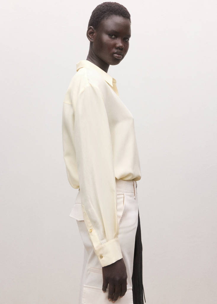 100% mulberry silk. Straight design. Shirt collar. Long sleeves with buttoned cuffs. Asymmetric hem. Front button fastening with concealed placket. Selection Collection